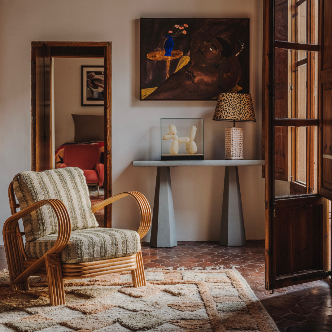 Bamboo Lounge Chair Green är en sofistikerad fåtölj tillverkad av premiumbambu, lätt betsad för att ge materialet en tidlös vintagekänsla. Den elegant formade bamburamen kompletteras vackert av mjuka sitt- och ryggdynor, klädda i ett randigt linnetyg i mjuka, ljusgröna nyanser. Denna harmoniska blandning av naturliga texturer och subtila toner skapar en varm och inbjudande vintage estetik.