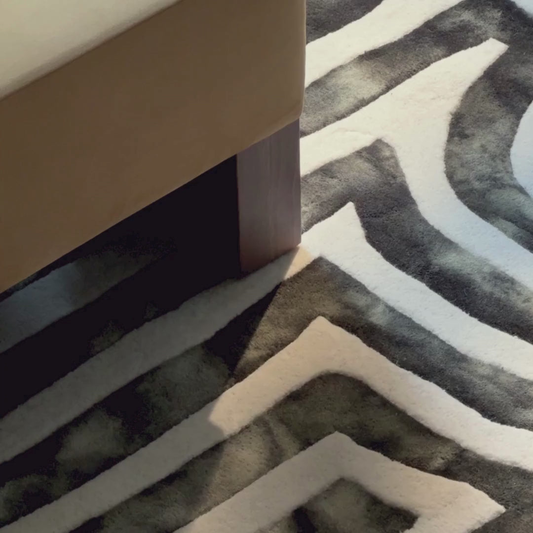 Psychedelic Labyrinth Rug Charcoal är en mönstrad matta tuftad för hand. Den är gjord av 100 % ull med bomullsbaksida. Baksidan ökar mattans hållbarhet och livslängd samt bibehåller formen. Varje matta färgas individuellt, vilket resulterar i variationer i färg och intensitet. Detta gör varje matta unik och bidrar till dess karaktär. Psychedelic Labyrinth Dip Dye Rug finns även i en beige version. Både kol- och beigeversionen finns i två storlekar, 200 x 300 cm och 300 x 400 cm.