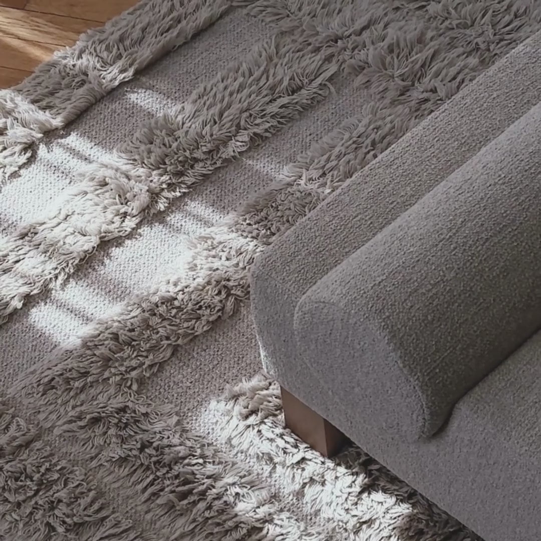 Shaggy Labyrinth Rug Grey är en mönstrad matta gjord av 100 % ull. Genom att kombinera två typer av produktionstekniker, plattväv och lurvig lugg, får mattan sitt unika höga och låga utseende. Utöver den här gråa versionen innehåller serien även en vit och en beige modell. Alla färger finns i storlekarna 200 x 300 cm, 250 x 350 cm och 300 x 400 cm.