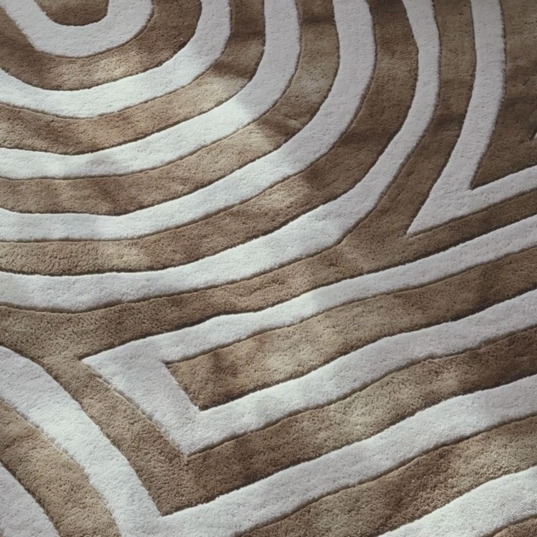Psychedelic Labyrinth Rug Beige är en handtuftad matta gjord av 100 % ull. På mattans baksida har en baksida av bomull applicerats. Detta säkerställer att mattan behåller sin form och ökar mattans hållbarhet och livslängd. Varje matta är individuellt färgad, vilket gör varje matta unik då färgerna ändras i nyans och intensitet. Psychedelic Labyrinth Beige Dip Dye Rug finns i storlekarna 200 x 300 cm och 300 x 400 cm. Utöver denna beige modell finns det även en mörkgrå variant i samma serie.