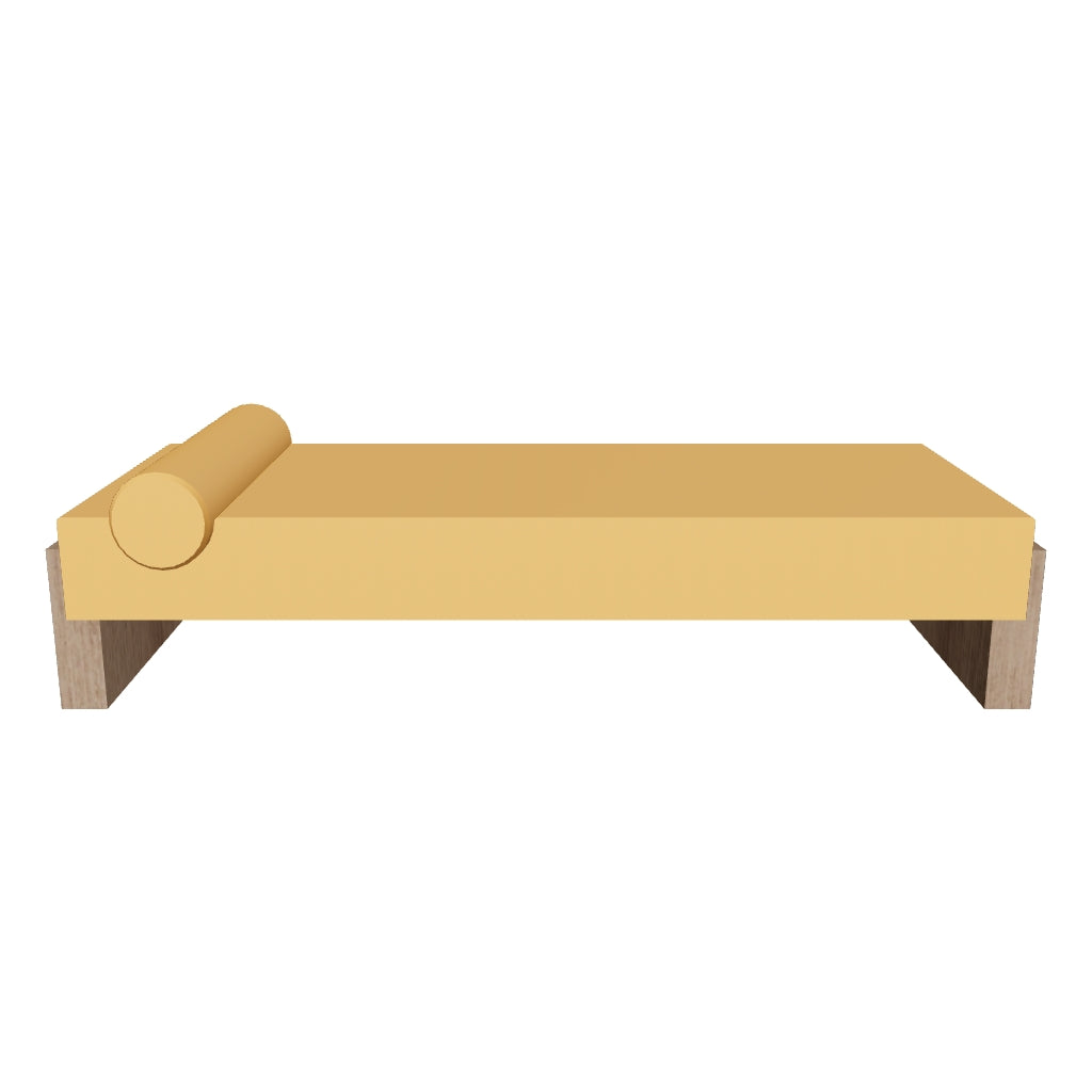 V Day Bed Velvet är en handgjord dagbädd gjord av hantverkare med lång erfarenhet av trä och klädsel, denna dagbädd har en ram och ben som gjorts av massiv bok. Benen kännetecknas av sin V-form, en estetisk signatur för flera av Dusty Decos möbler. Träet har betsats och vaxats för att få rätt färg och känsla, något som för tankarna till äldre vintagemöbler. I denna version är V Day Bed Velvet täckt av en senapsgul textil som ger den ett mysigt och varmt uttryck.